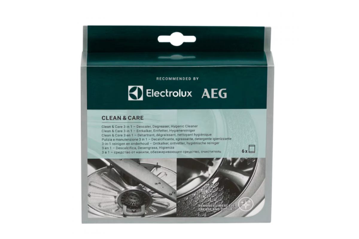 Clean & Care 3 in 1 ir efektīvs kopšanas līdzeklis veļas un trauku mazgājamām mašīnām AEG un Electrolux. Formula vienlaikus atkaļķo, attauko un attīra ierīces iekšējās daļas, nodrošinot optimālu darbību.